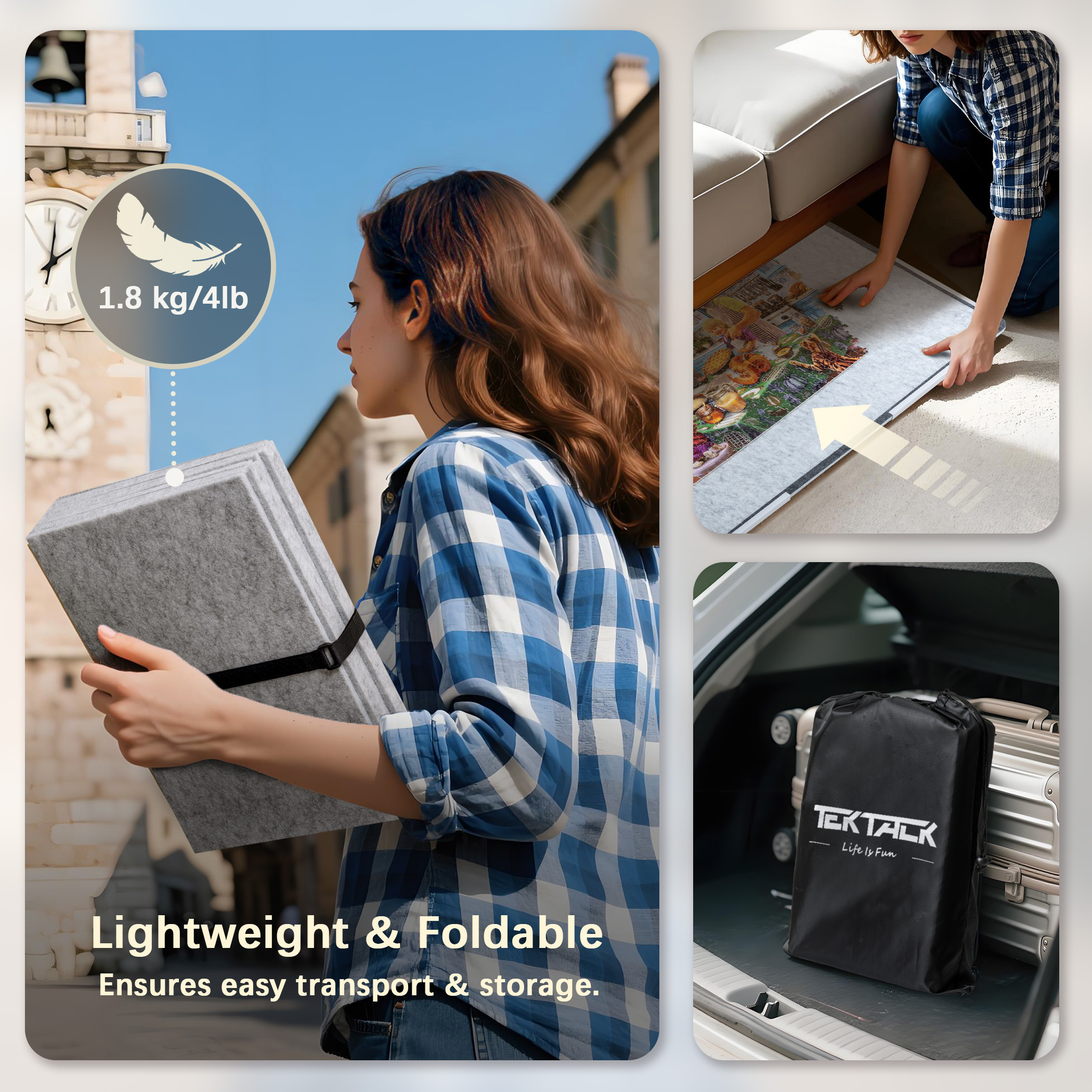 - Foldaway Design – puzzle board can be folded into an ultra-compact size (12.6 × 10.6 × 3.1 in / 40.5 × 27 × 8 cm) for easy home storage when not in use. Lightweight and foldable, it fits neatly into a storage bag and allows you to take it anywhere you like to continue with your puzzle fun.