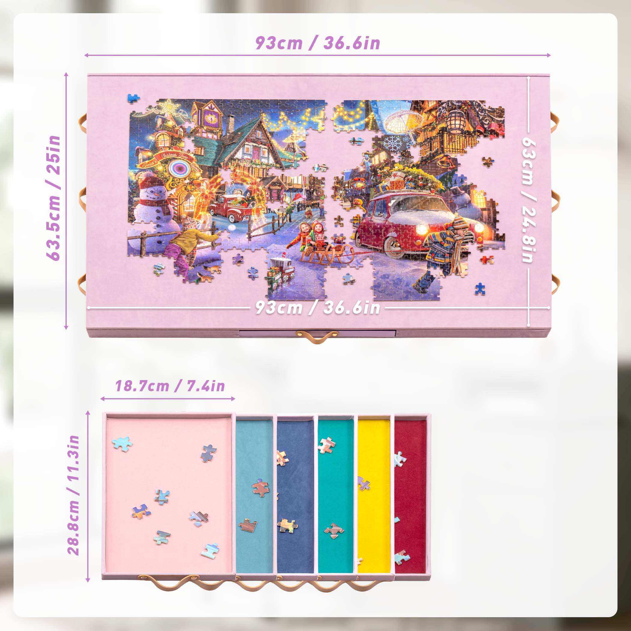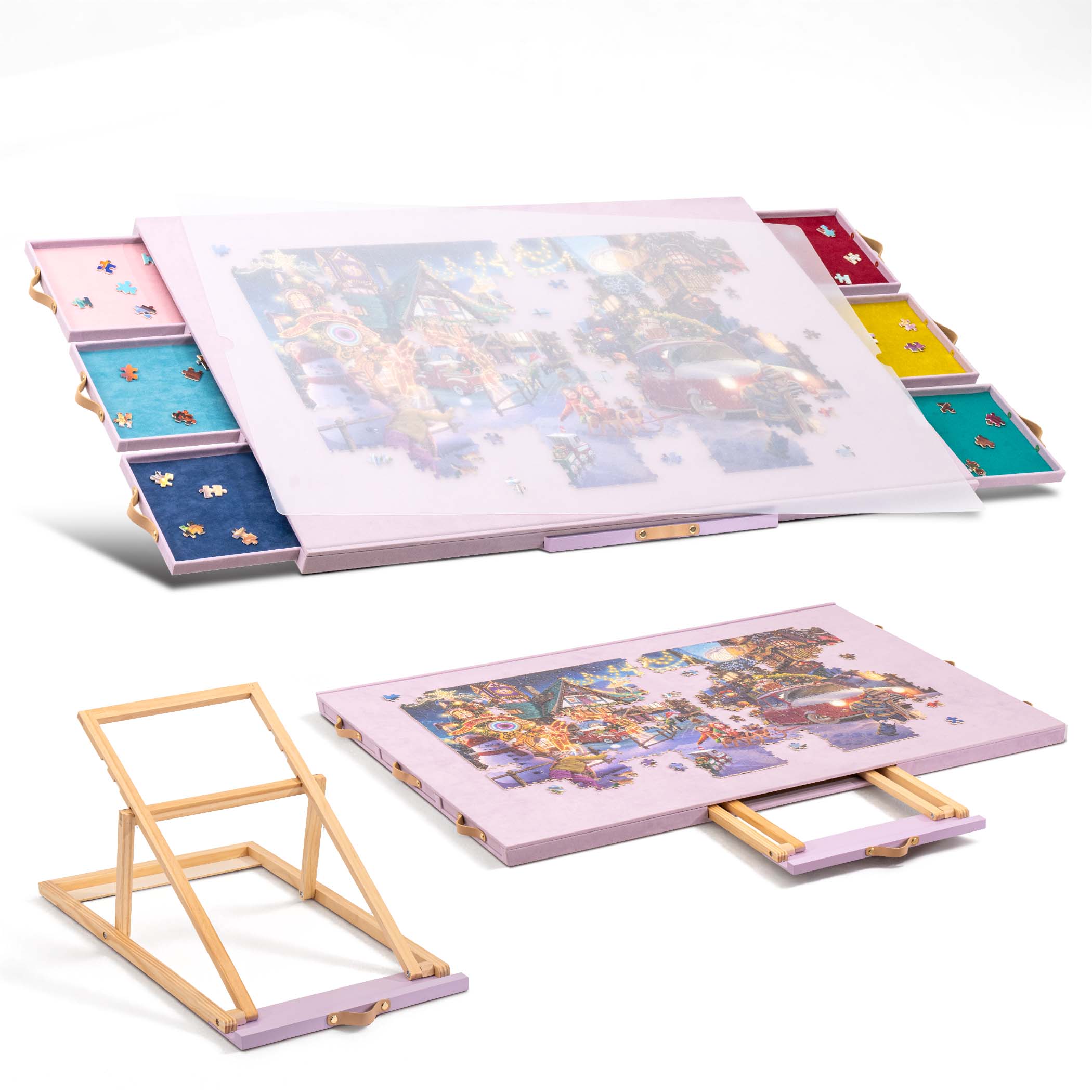- Felt Covering – The soft velvet layer keeps puzzle pieces in place—no slipping even when tilted! The full-wrap velvet base adds grip to prevent sliding, while raised edges stop pieces from falling off.