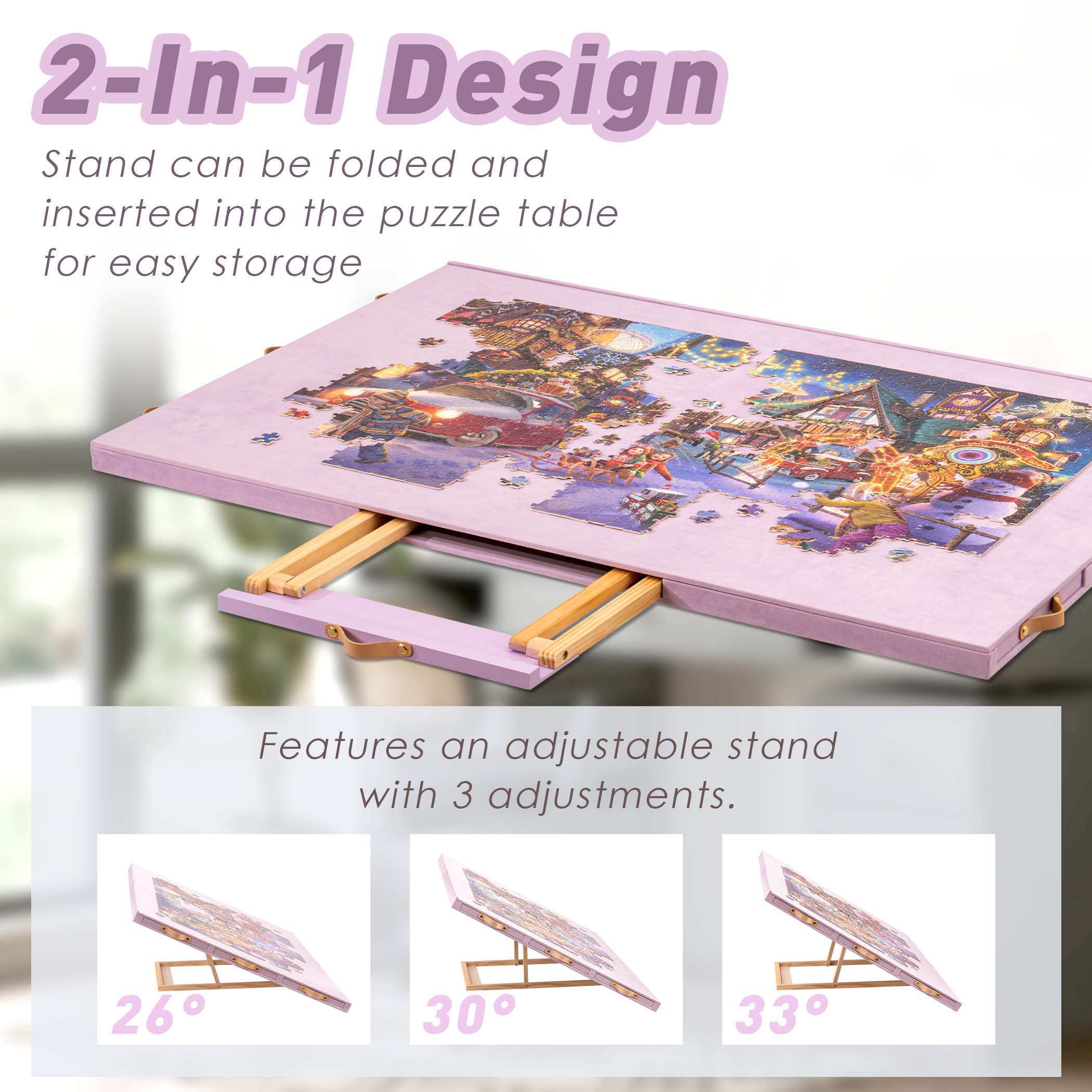 - 2-In-1 Built-in Stand – Our puzzle table features an adjustable stand with 3 tilt angles (up to 30°), allowing you you to customize it for neck and back comfort while puzzling. When not in use, the stand tucks neatly inside the table for hassle-free storage.
