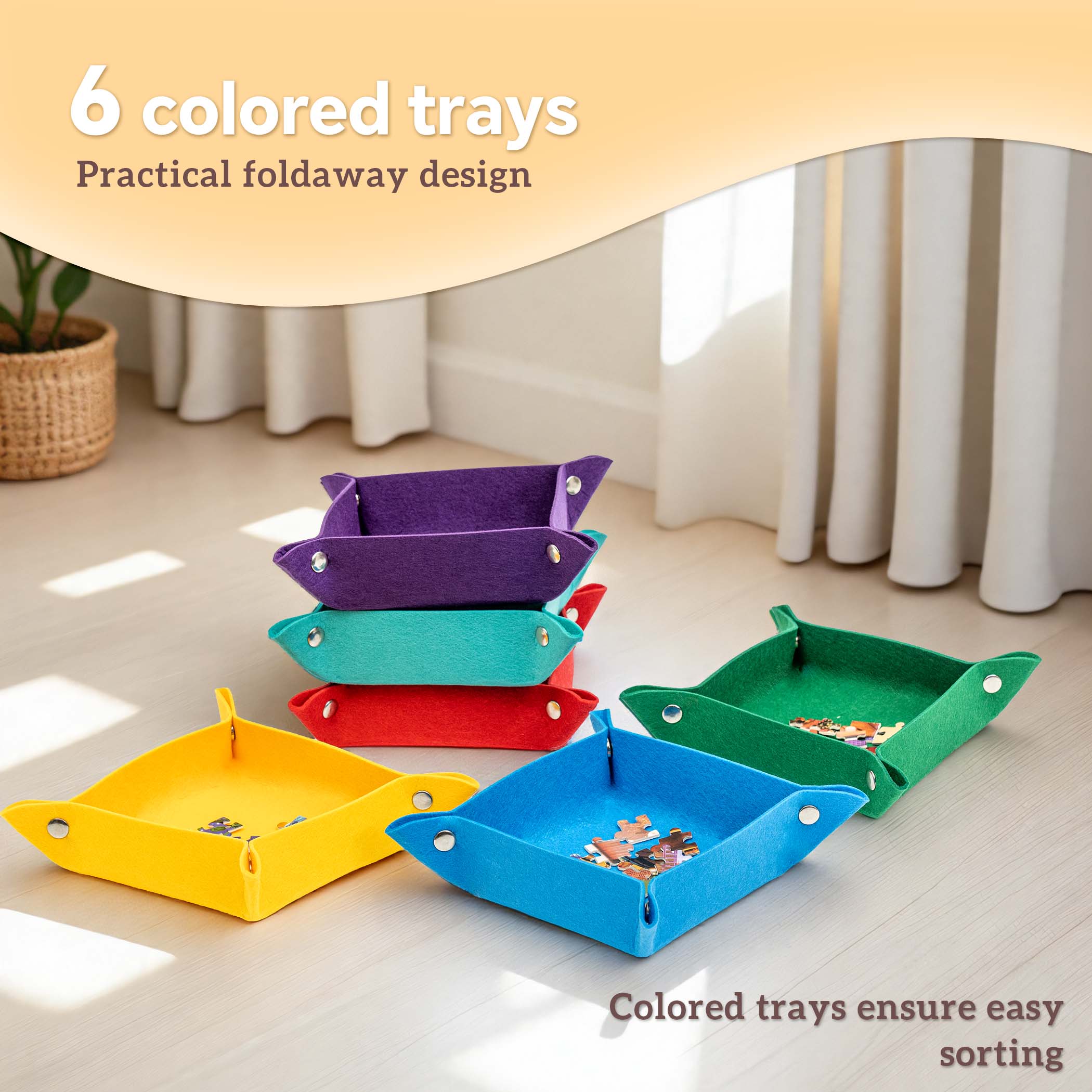 - Color-Coded Felt Lined Storing Trays – Includes 6 collapsible colored felt sorting trays to organize puzzle pieces by color and make the fun game even easier. Trays also serve as storage compartments to save progress.